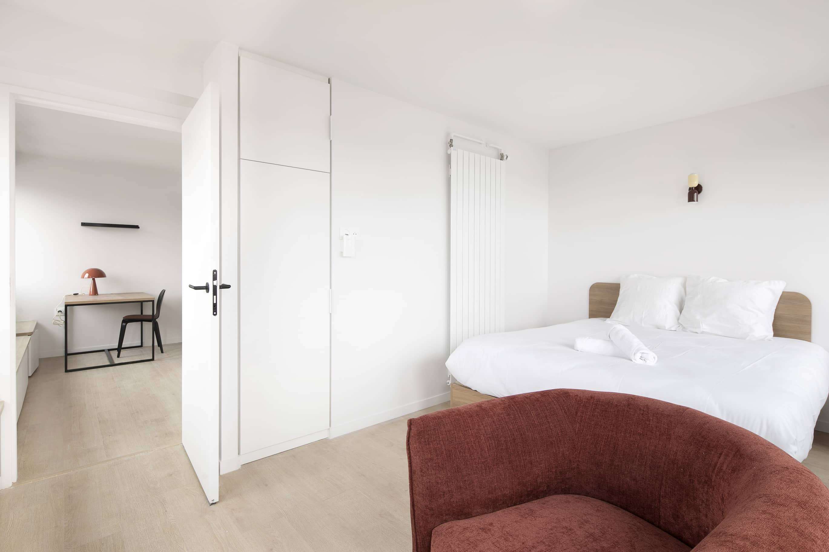 Votre futur chez-vous, l'unité privative One-bedroom Flat (T2) - 708, se trouve au septième étage et est parfaitement adaptée pour deux personnes. Cette chambre lumineuse dispose d'un lit double confortable, d'une armoire spacieuse, d'un bureau pratique pour travailler et d'une chaise. La salle de bain privative est équipée d'une douche moderne, d'un lavabo et de toilettes séparées. La kitchenette vous permettra de préparer des repas simples avec les plaques de cuisson situées dans la Home, partagée avec d'autres locataires.