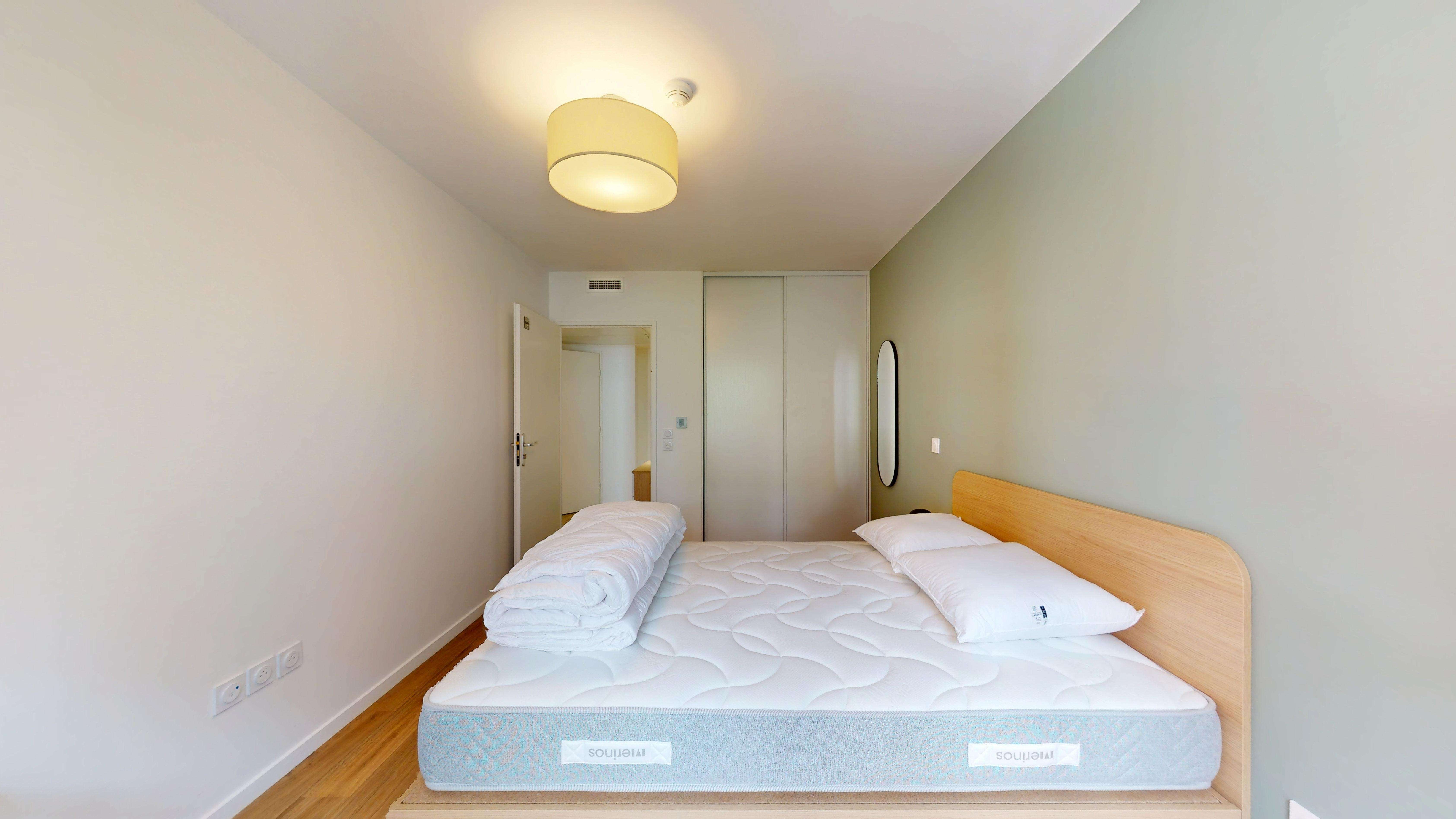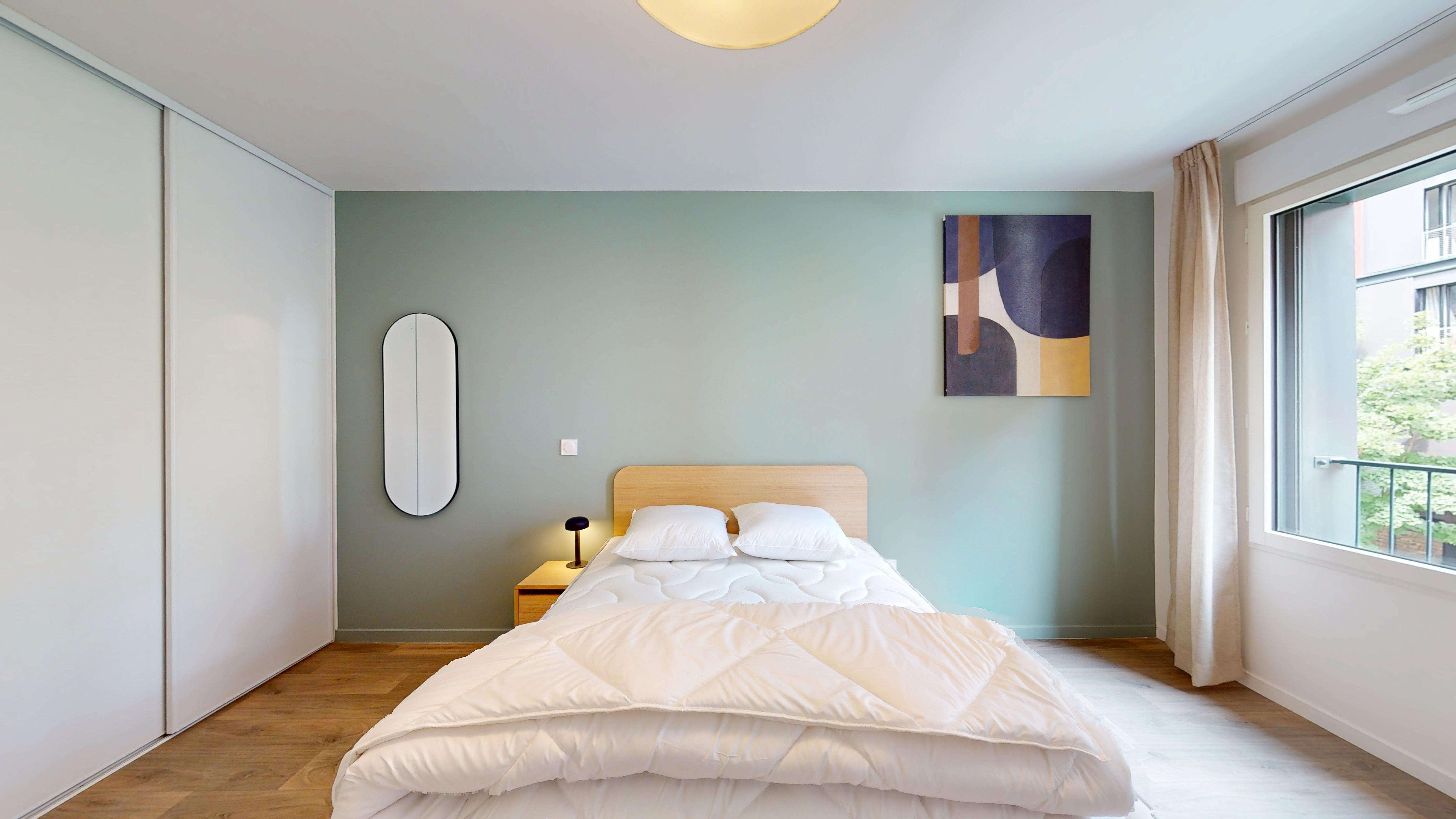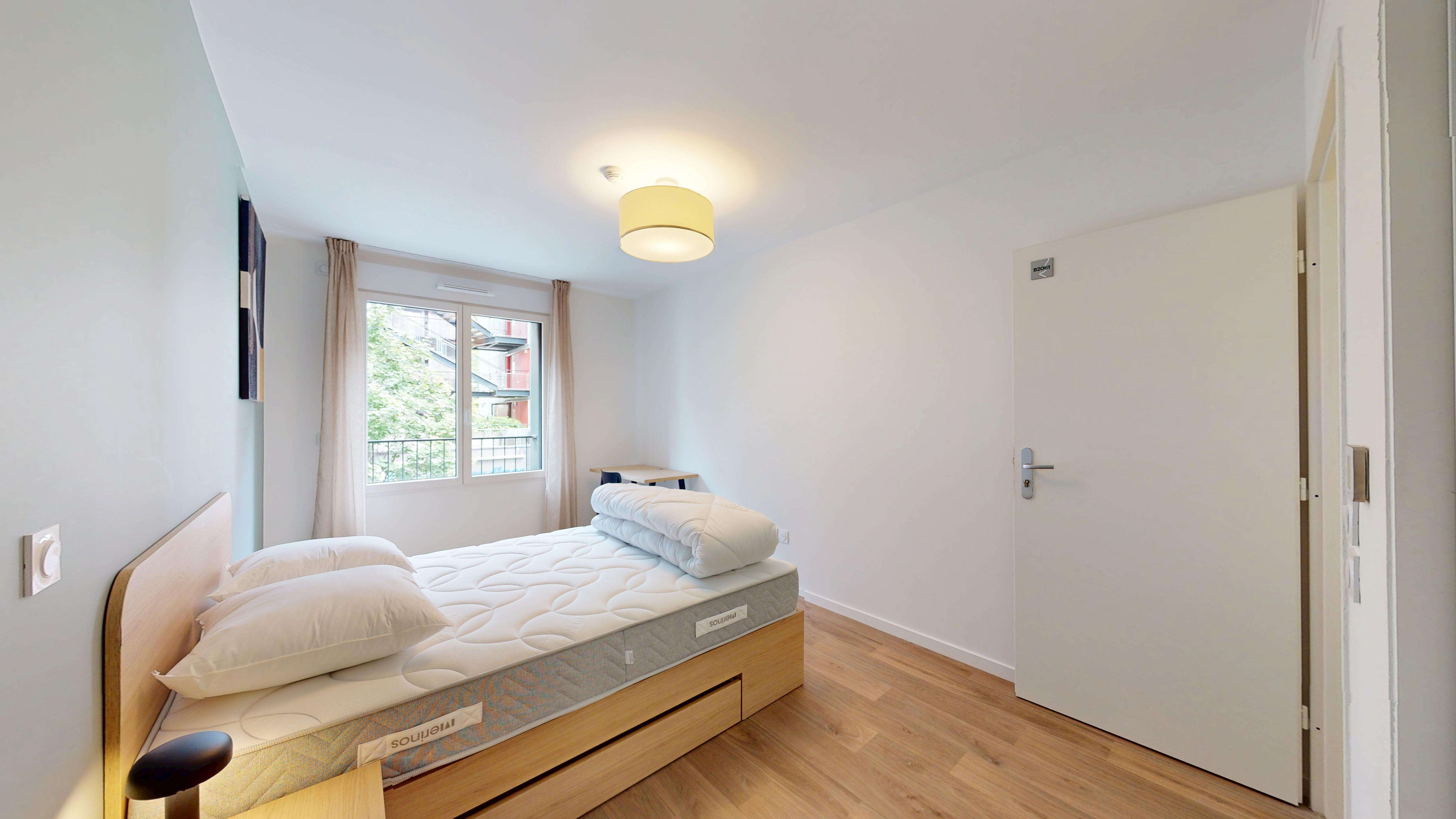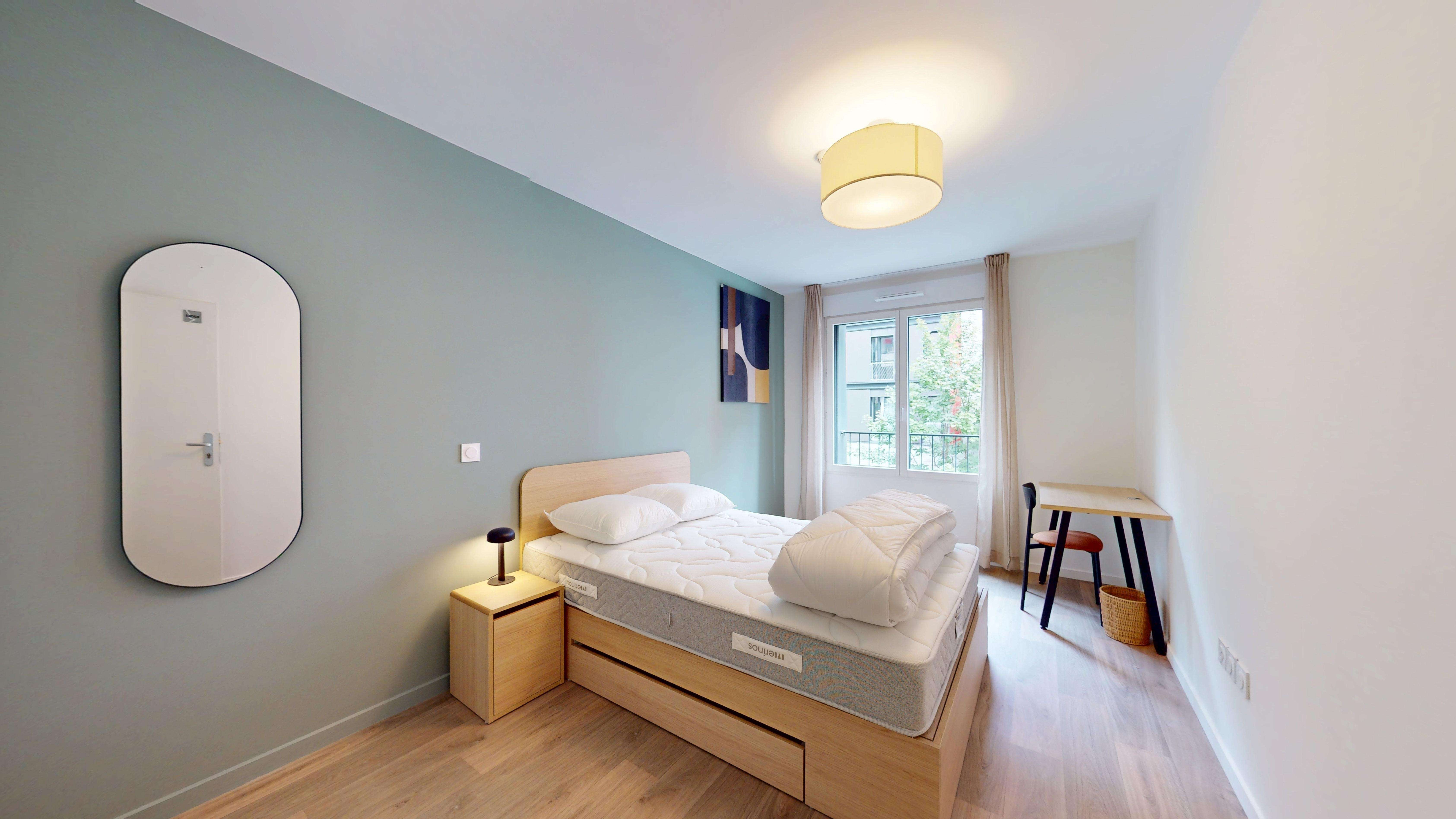 La Chambre Zen est un havre de paix personnel. Avec ses 15 m², elle est meublée d'un lit confortable, d'un bureau pour travailler et d'espaces de rangement pour vos affaires. La chambre bénéficie d'une salle de bain privée moderne avec une douche, ce qui vous assure intimité et confort.