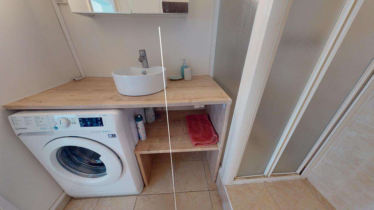 Cette colocation offre deux salles de bain composées chacune d’une cabine de douche, d’un meuble vasque et d’un miroir. L’une d’entre elle est dotée d’un lave linge.