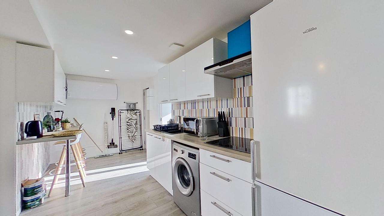 Cette colocation de trois chambres s'ouvre sur la pièce de vie avec la cuisine ouverte. Cette dernière est équipée d'un réfrigérateur avec congélateur, des plaques de cuisson avec une hotte, un micro-ondes, une bouilloire, un mixeur, un grille-pain, une machine à laver, un évier avec un égouttoir ainsi que de nombreux rangements. Un mange-debout avec quatre chaises hautes viennent compléter cette pièce. Le salon est aménagé d'un canapé, de deux tables basses, une banquette ainsi qu'une télévision.