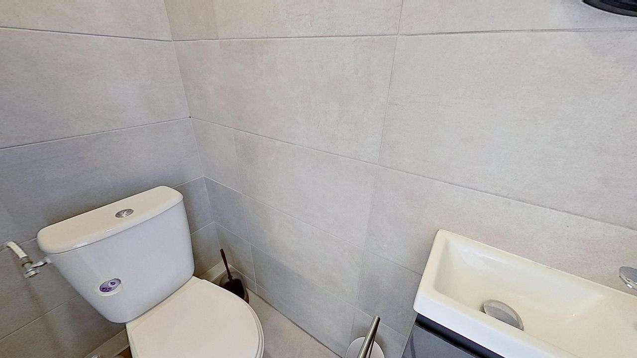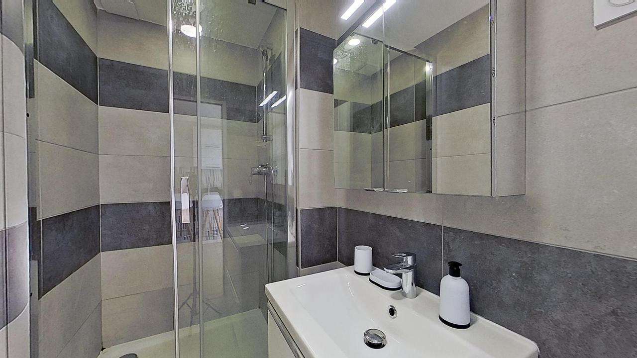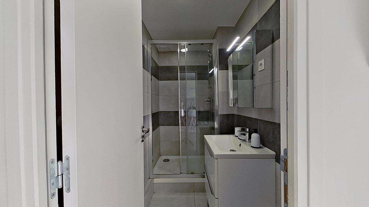La salle d'eau dispose d'une cabine de douche ainsi que d'un meuble vasque avec un miroir. Les toilettes sont séparées.