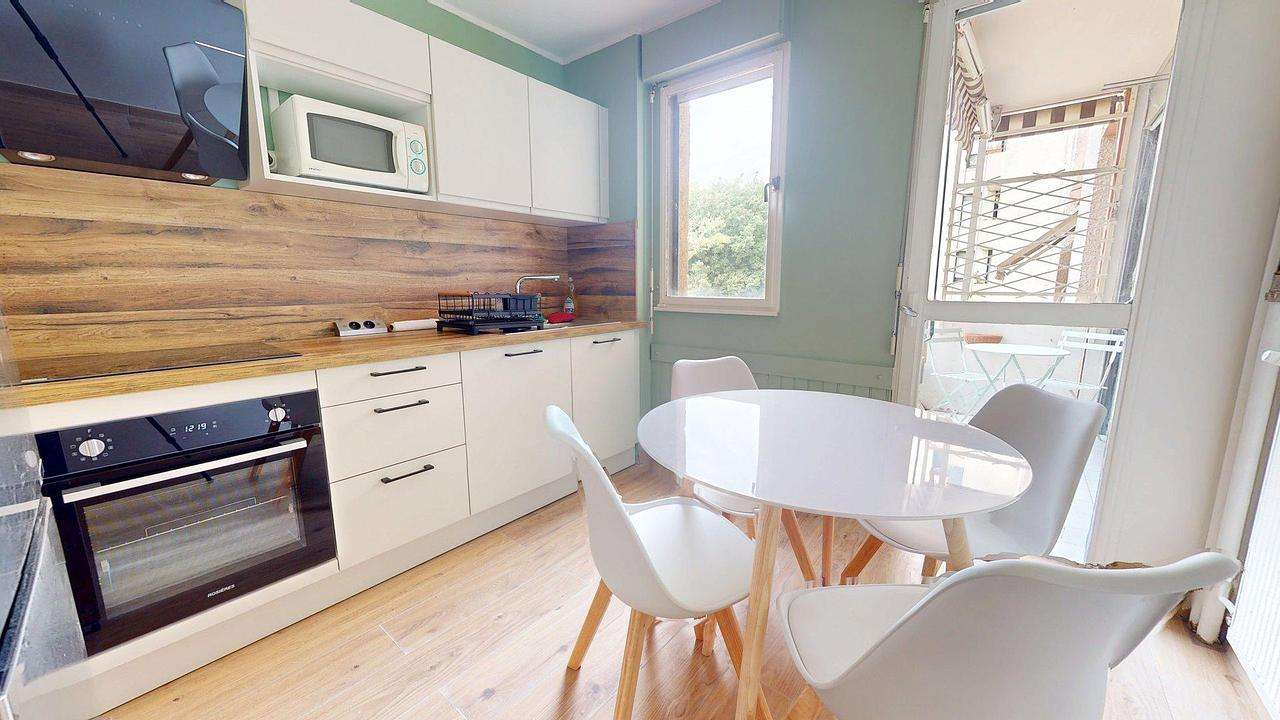 La cuisine est spacieuse et entièrement équipée avec : four, micro-ondes, plaques de cuisson, hotte, réfrigérateur congélateur, évier, nombreux rangements et toute la vaisselle nécessaire. L'espace comporte également une table ronde avec quatre chaises. La cuisine donne accès direct à un balcon avec vue dégagée sur les arbres, idéal pour les pauses café ou les repas d’été.