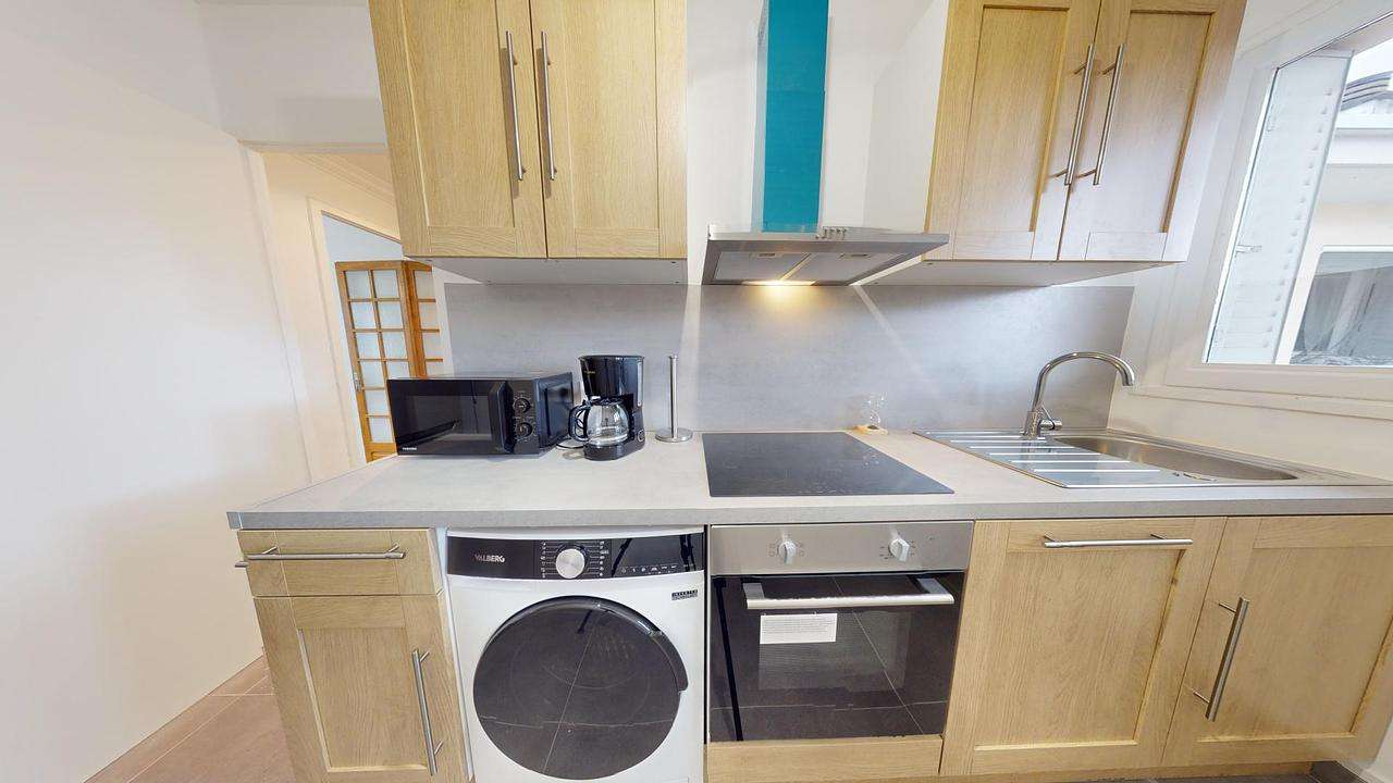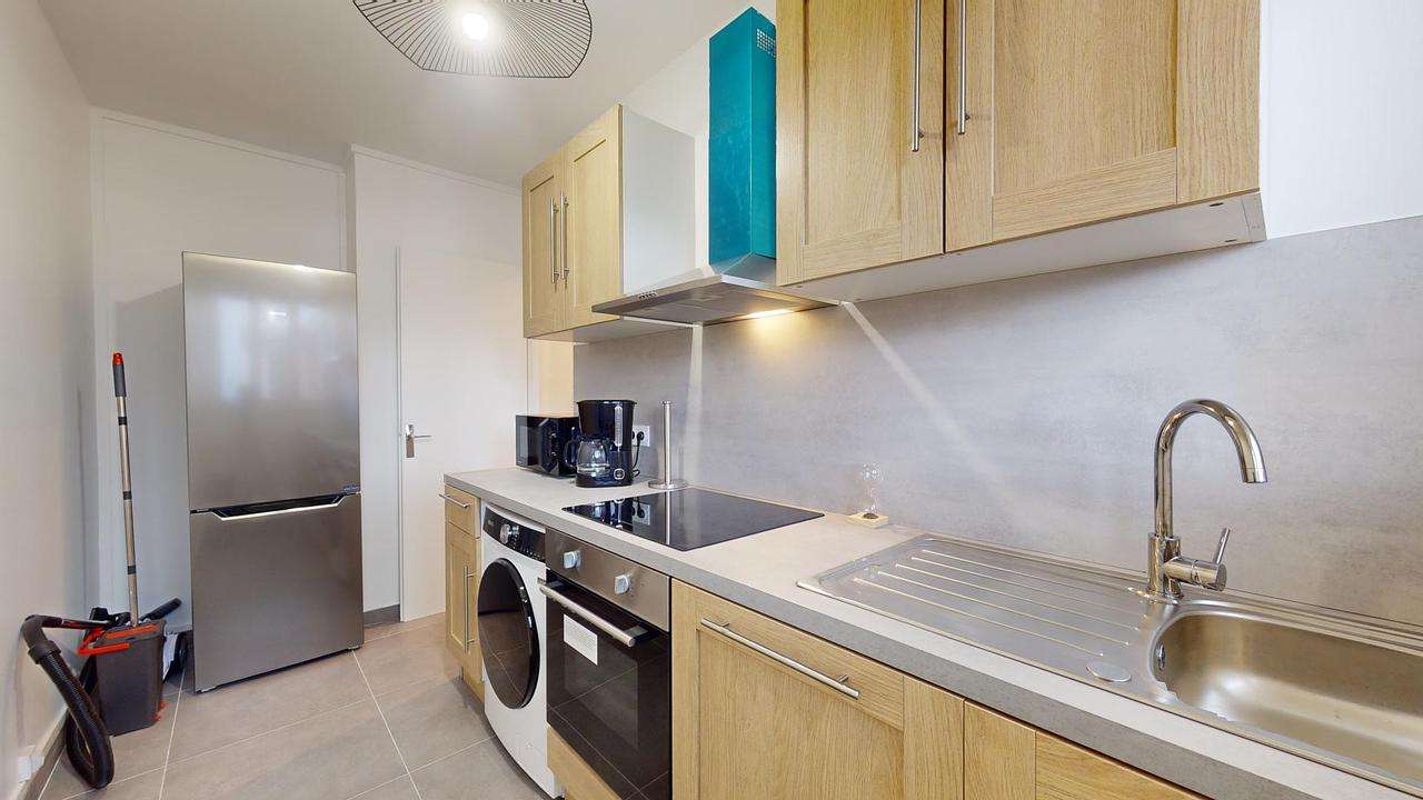 La cuisine est équipée d'un réfrigérateur avec congélateur, d'un micro-ondes, d'une machine à café, d'un lave-linge, d'un four, de plaques de cuisson avec une hotte, d'une machine à café, d'un lave-vaisselle ainsi que de nombreux rangements.