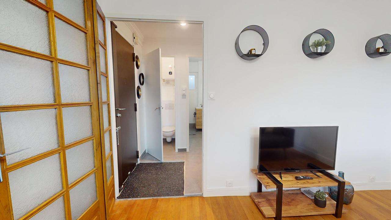 Cette colocation de deux chambres s'ouvre sur un séjour aménagé d'un canapé convertible, d'un meuble TV avec une télévision, d'une bibliothèque ainsi que d'une table avec quatre chaises, idéal pour partager des repas entre colocataires.