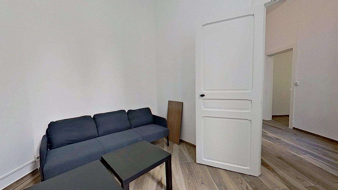 Cette colocation de trois chambres s'ouvre sur une pièce de vie aménagée d'un canapé, de deux tables basses et d'un fauteuil.