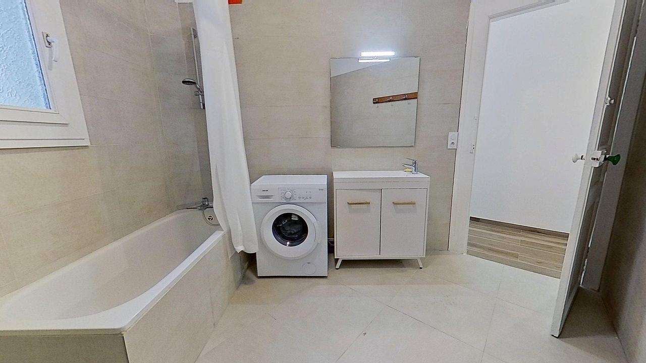 La salle de bain dispose d'une baignoire, d'une douche, d'un meuble vasque avec un miroir ainsi que d'une machine à laver.