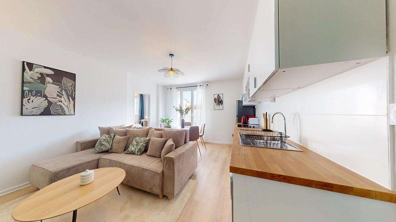 L’appartement offre une belle pièce de vie lumineuse composée d’un salon moderne avec canapé d’angle, télévision et table basse, ouvert sur une cuisine entièrement équipée. Celle-ci dispose d’un four, de plaques de cuisson, d’un micro-ondes, d’un lave-vaisselle, d’un grand réfrigérateur-congélateur et de nombreux rangements. Un coin repas avec table ronde et chaises complète cet espace convivial.