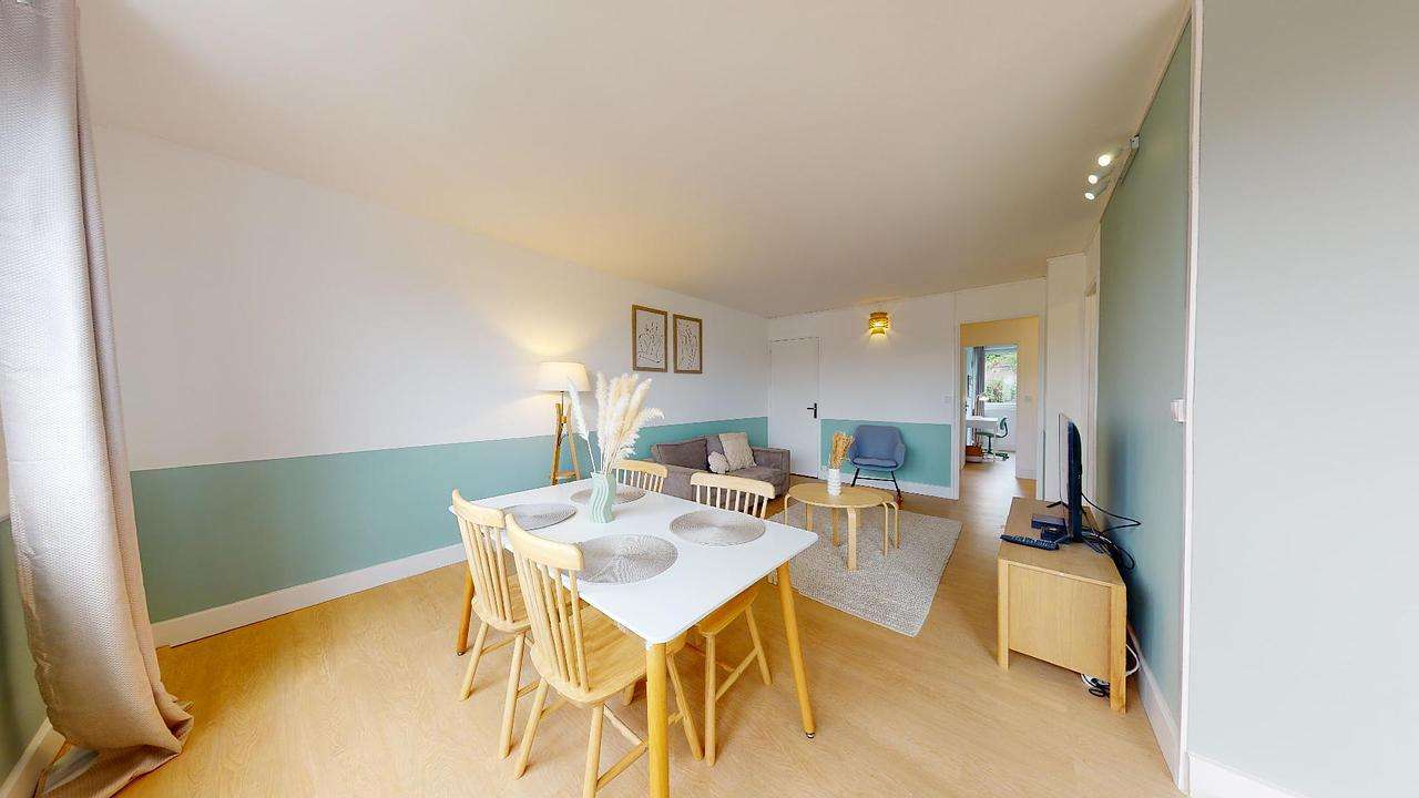 Le salon, très lumineux, est aménagé d'une table avec quatre chaises, idéal pour partager des repas entre colocataires, un canapé, deux tables basses, un fauteuil, un meuble TV avec télévision et plusieurs éléments de décoration ainsi qu'un placard mural.