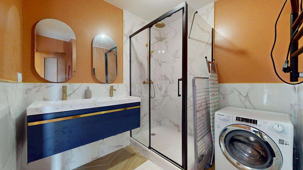 La salle d’eau comprend une douche, un meuble vasque avec miroir, une machine à laver et des rangements.
