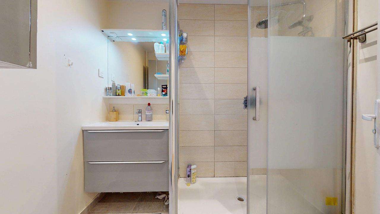 Côté sanitaires, le logement dispose de deux salles de bain, chacune équipée d’une douche, d’un meuble vasque avec miroir et de rangements. Les WC sont séparés. Une machine à laver est également à disposition.