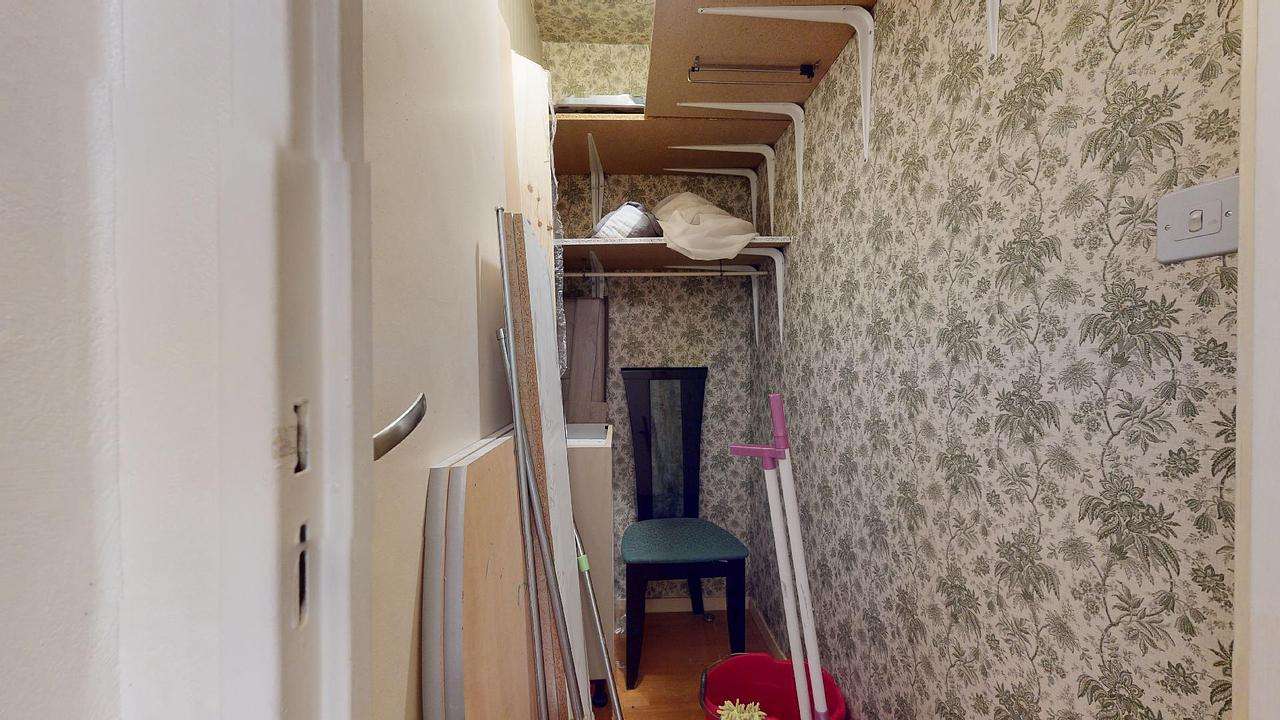 La chambre est équipée d'un bureau, d'un lit et d'une penderie.