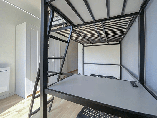 La chambre est équipée d'un lit double en mezzanine, un bureau avec chaise et un placard.