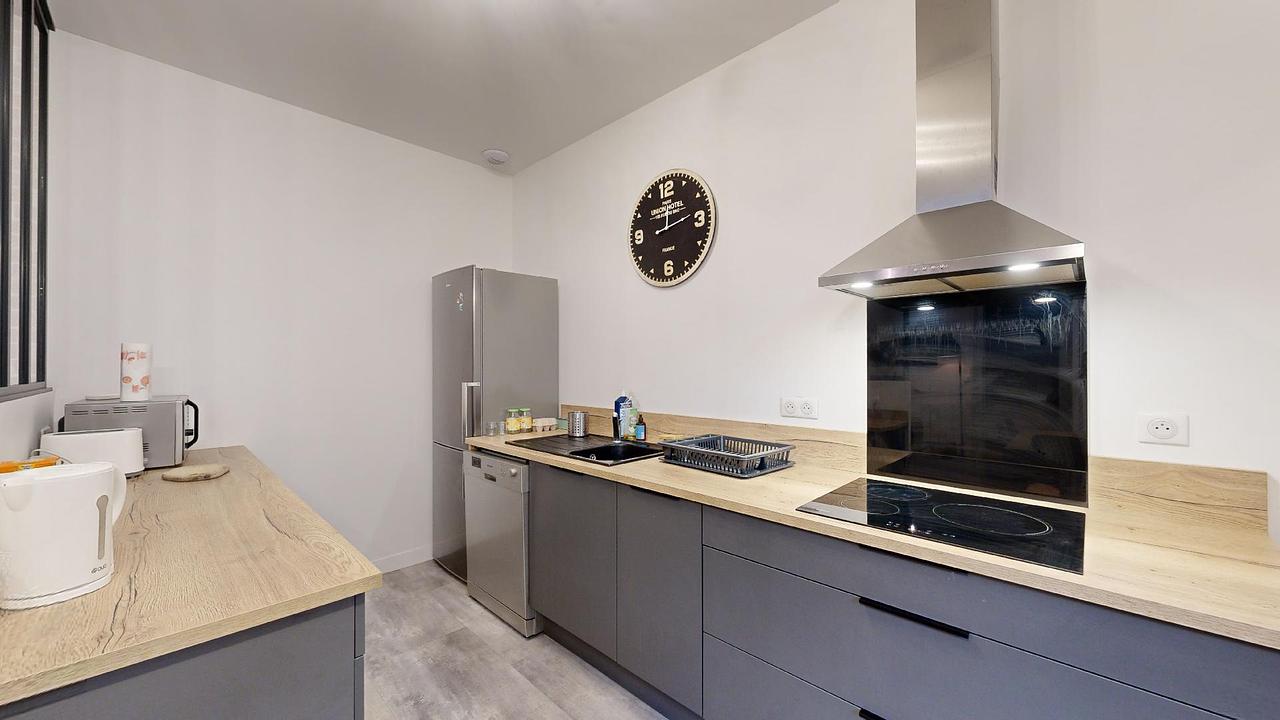 La cuisine s'accompagne d'un meuble de rangement. Elle comporte également un four, un lave-vaisselle, une machine à café, un micro-ondes et une plaque de cuisson.