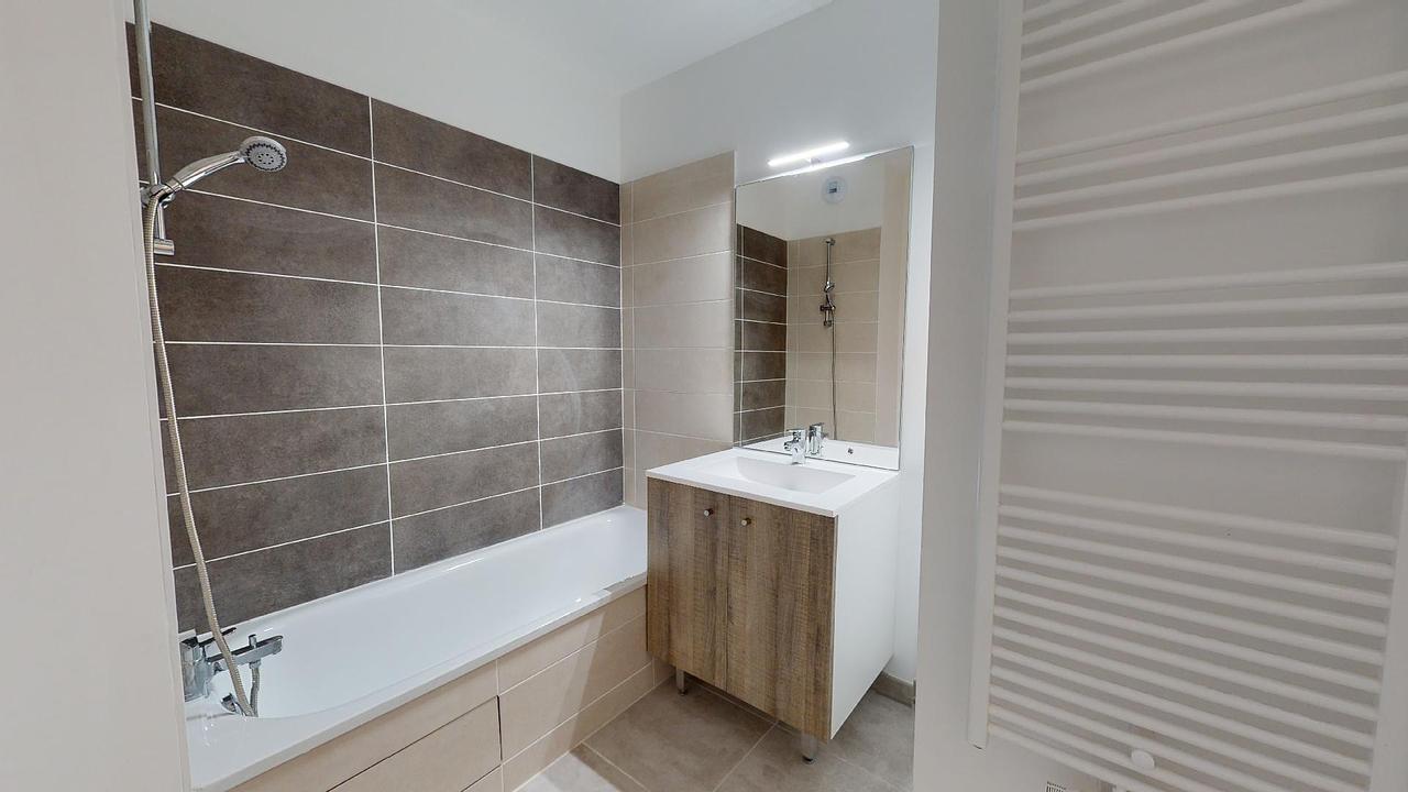 Une salle de bain avec baignoire et meuble vasque ainsi que des WC séparés viennent compléter ce logement.