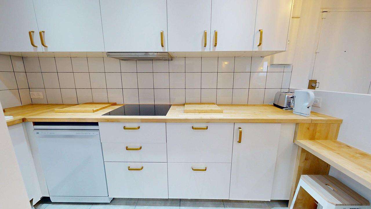 La cuisine, séparée mais ouverte sur la salle à manger, est équipée de tout le nécessaire : four, micro-ondes, lave-vaisselle, réfrigérateur, plaques de cuisson, bouilloire et grille-pain. Son plan de travail en bois clair et ses finitions dorées apportent une touche moderne et élégante.