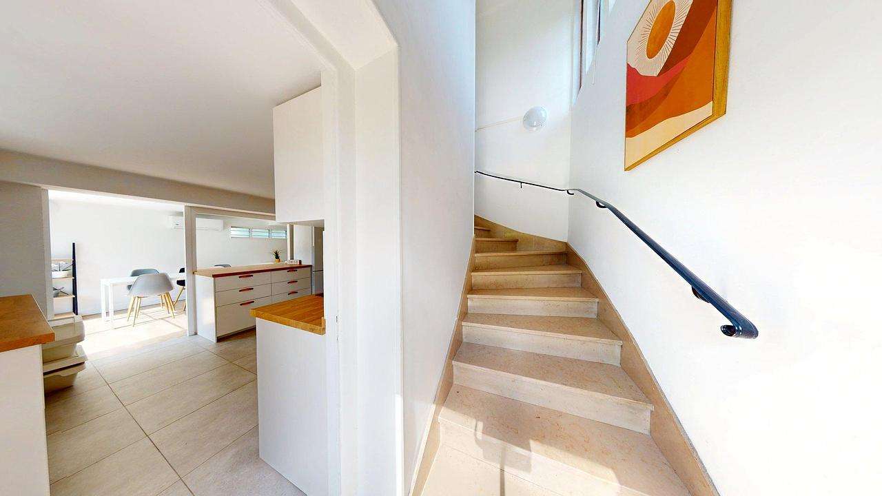La salle à manger dispose d'une grande table avec ses six chaises, une machine à café ainsi que de nombreux rangements. Cette pièce est attenante à la cuisine qui est séparée par un bar.
