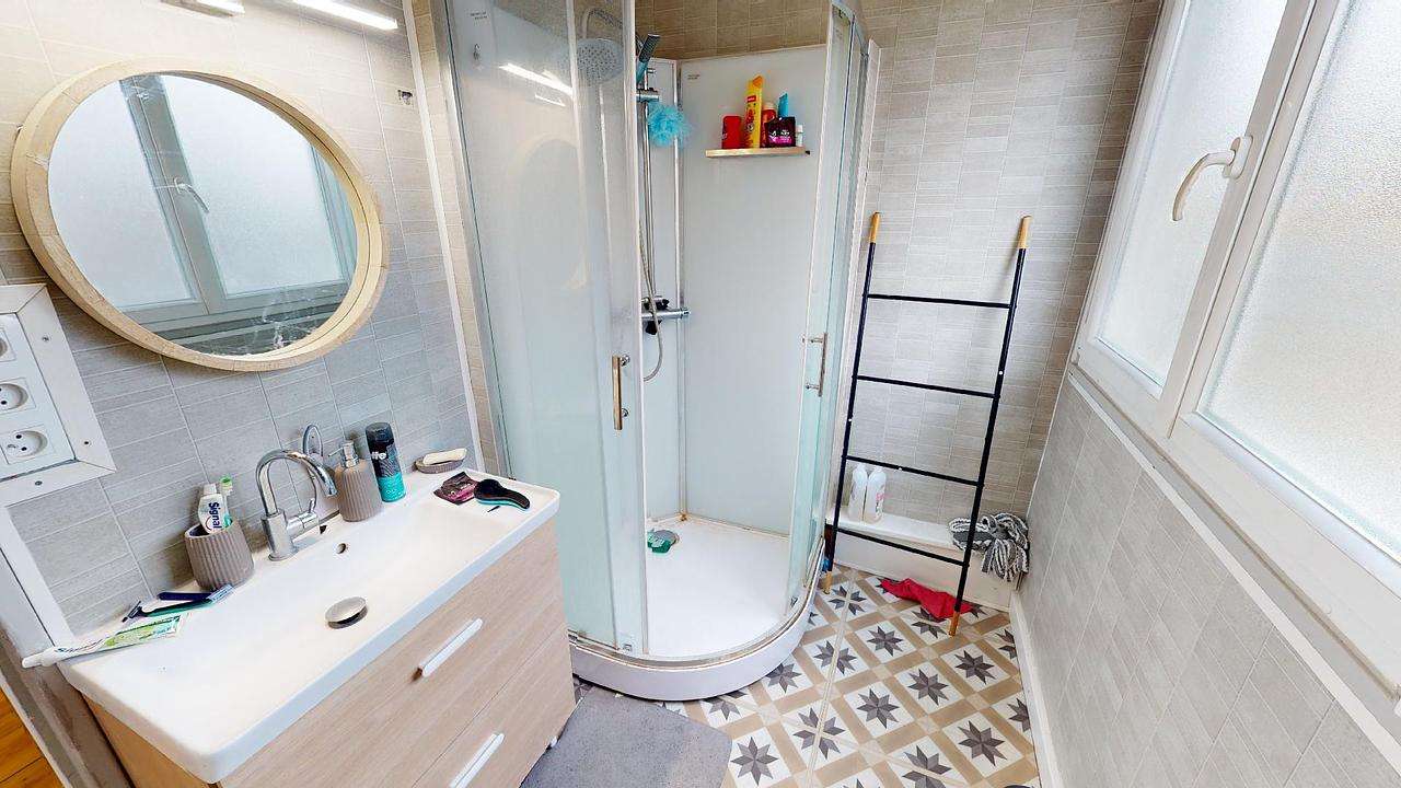 Le wc jouxte une salle de bain, laquelle est composée d’une cabine de douche d’angle, d’une vasque sur meuble, d’un sèche serviettes et d’un miroir.