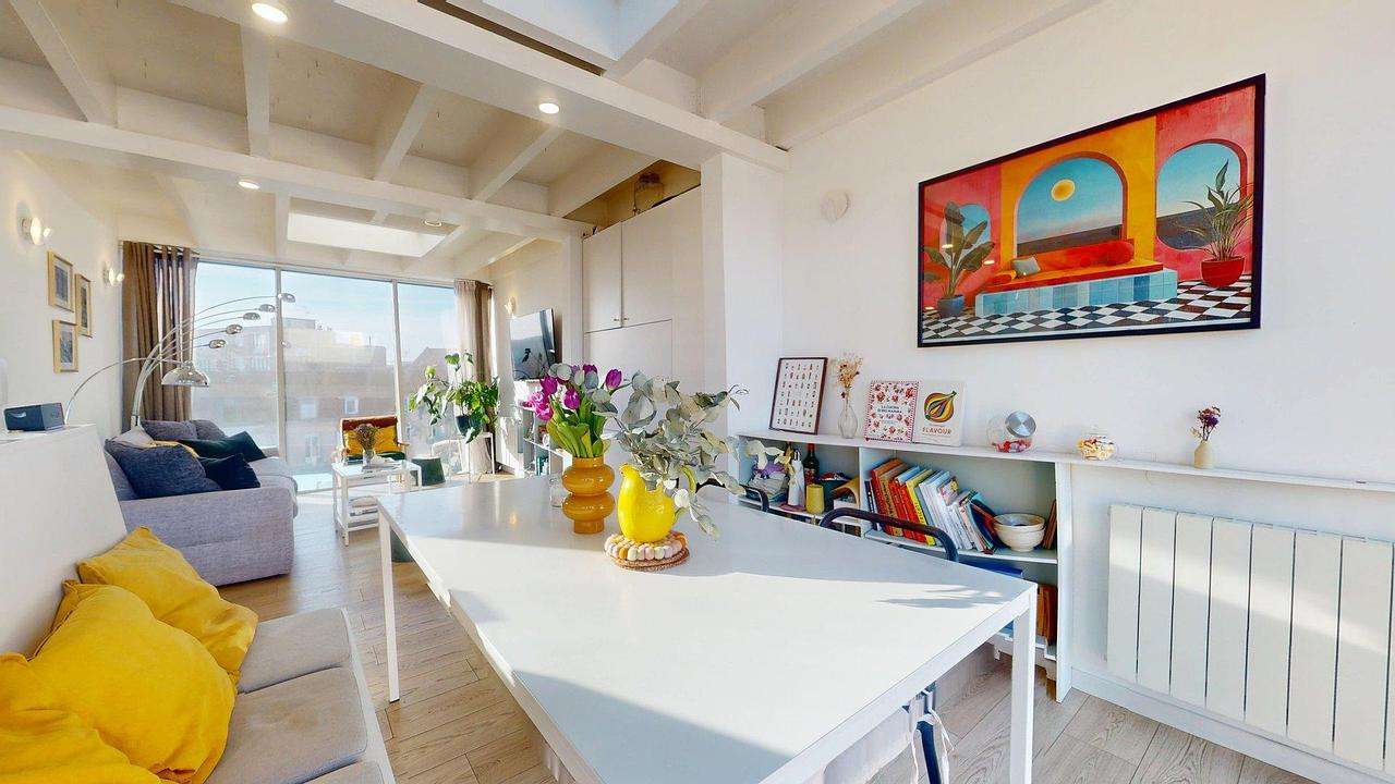 Séjour traversant, baigné de lumière naturelle, offrant une atmosphère chaleureuse et conviviale, donnant accès à un balcon aménagé avec mobilier extérieur pour profiter des beaux jours.