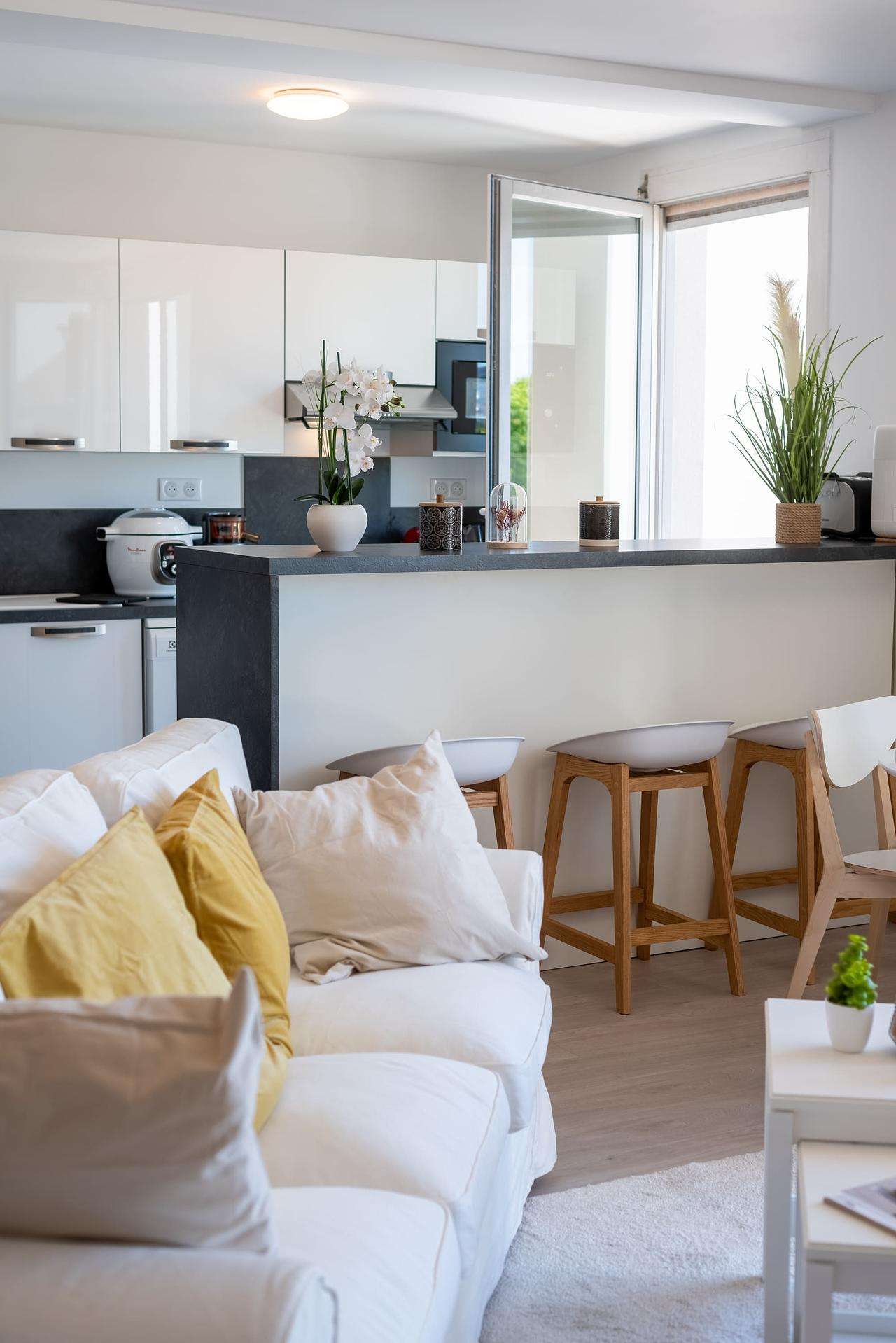 Ouverte sur ce dernier, on retrouve la cuisine entièrement équipée et spacieuse, mettant à disposition beaucoup de rangements et d’espaces de travail.