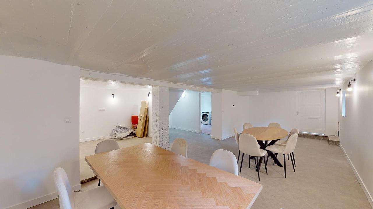 Un sous-sol idéalement meublé avec deux tables à manger, trois sèche-linge. Les propriétaires ont également installé des équipements sportifs.