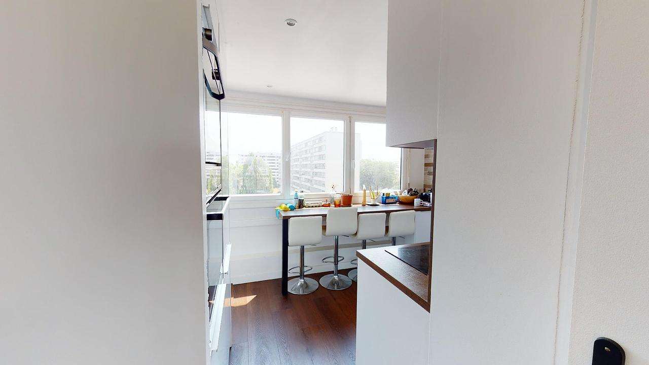 La colocation moderne et entièrement meublée possède 3 chambres. La pièce de vie lumineuse est équipée d'un canapé d'angle, table basse, TV et meuble TV et un espace salle à manger avec une table pour tous les colocataires.