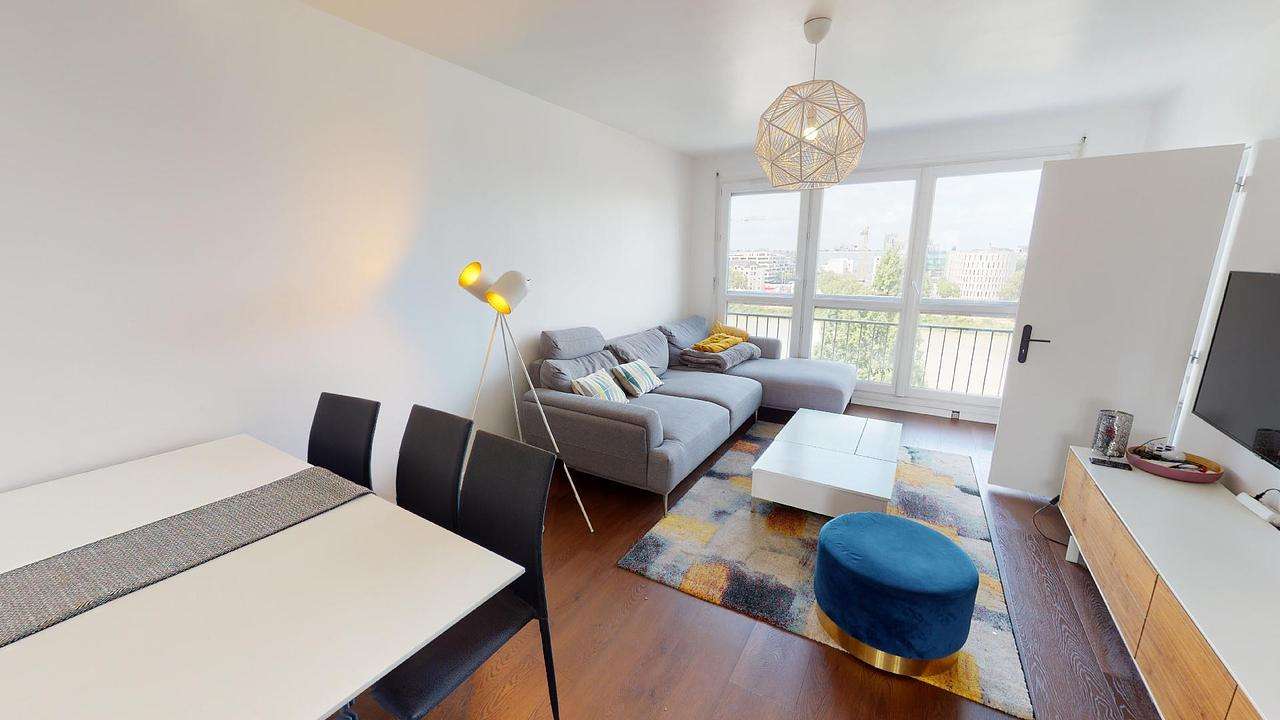 Une pièce de vie équipée (canapé, table basse, TV…) ouverte sur un espace salle à manger avec une table pour tous les colocataires.