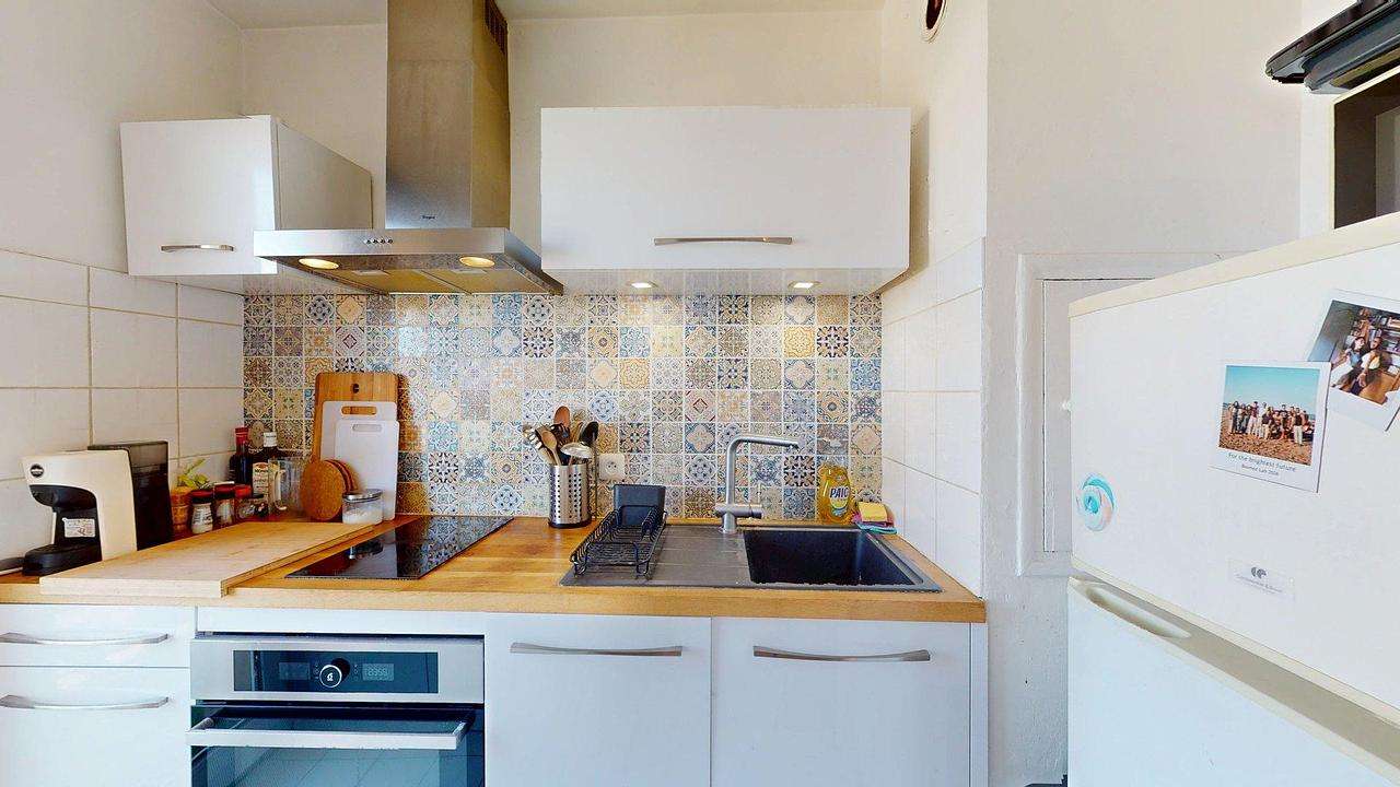 La cuisine est ouverte sur le séjour et dispose d’un aménagement fonctionnel avec un plan de travail en bois. Elle est équipée d’une plaque de cuisson, d’un four, d’un micro-ondes, d’un réfrigérateur, ainsi que d’un lave-linge. Les rangements hauts et bas permettent une organisation pratique au quotidien, et la crédence en carreaux décoratifs apporte une touche de caractère.