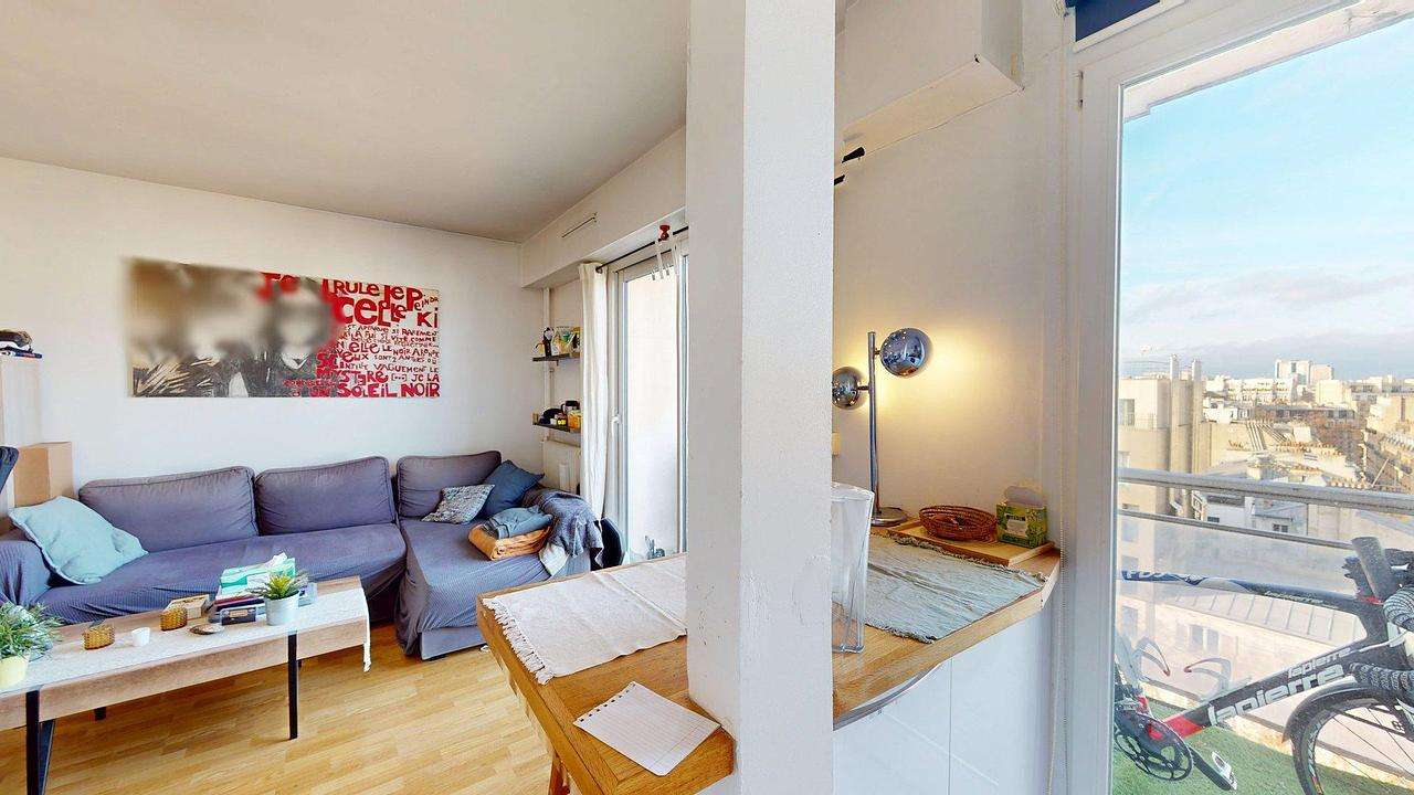 Le logement bénéficie d’un balcon accessible depuis la pièce de vie. Cet espace extérieur offre une vue dégagée sur les toits de Paris, avec un panorama remarquable incluant la tour Montparnasse et la tour Eiffel, visibles sur les photos.