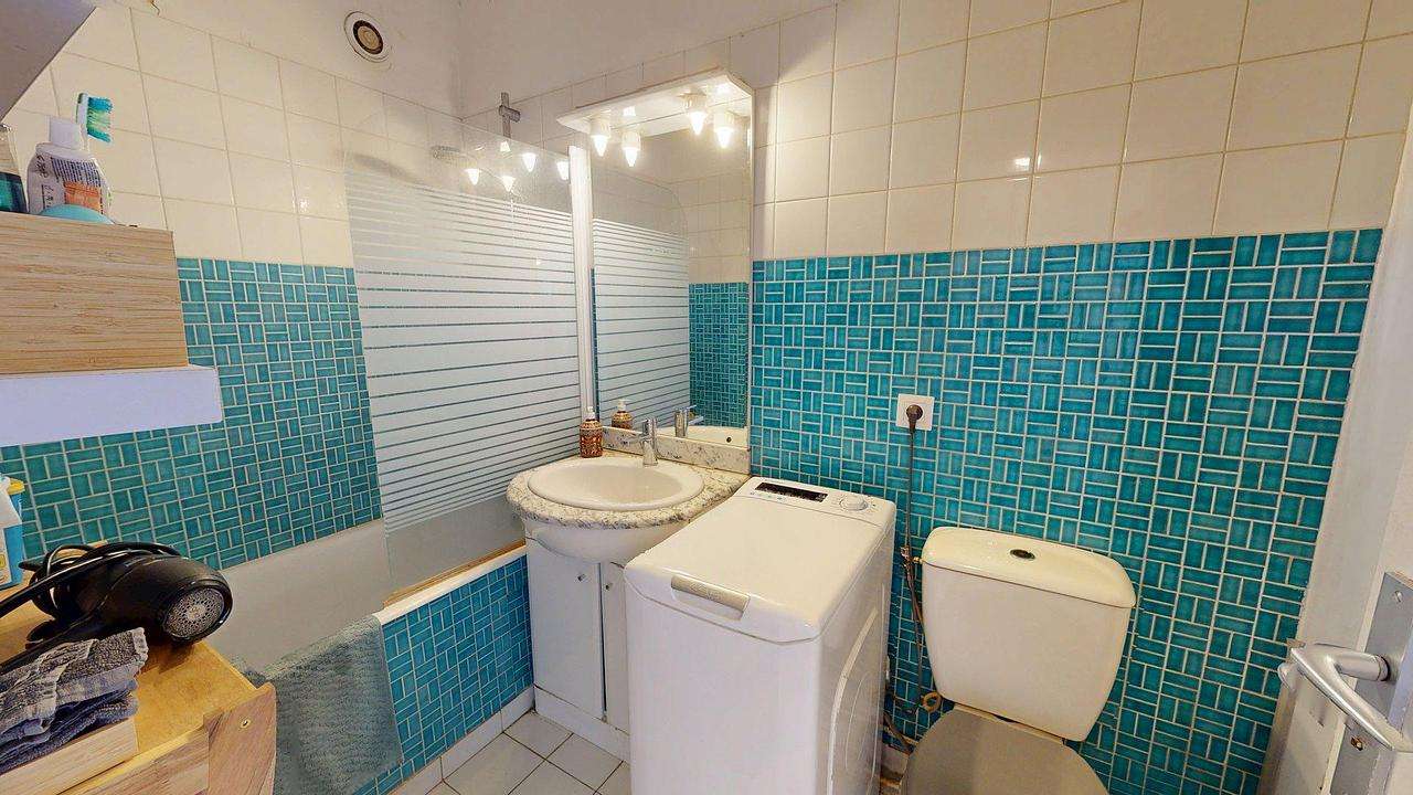 La salle d’eau est entièrement carrelée et comprend une douche avec paroi vitrée, un meuble vasque avec miroir et éclairage, ainsi que des toilettes. L’ensemble est compact et bien agencé.
