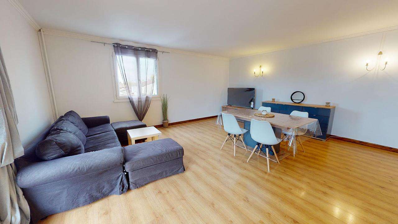 Cette colocation de quatre chambres s'ouvre sur une grande pièce à vivre. Le salon est aménagé d'un grand canapé, un meuble TV avec télévision, un buffet, une table avec quatre chaises, idéal pour partager des repas entre colocataires.