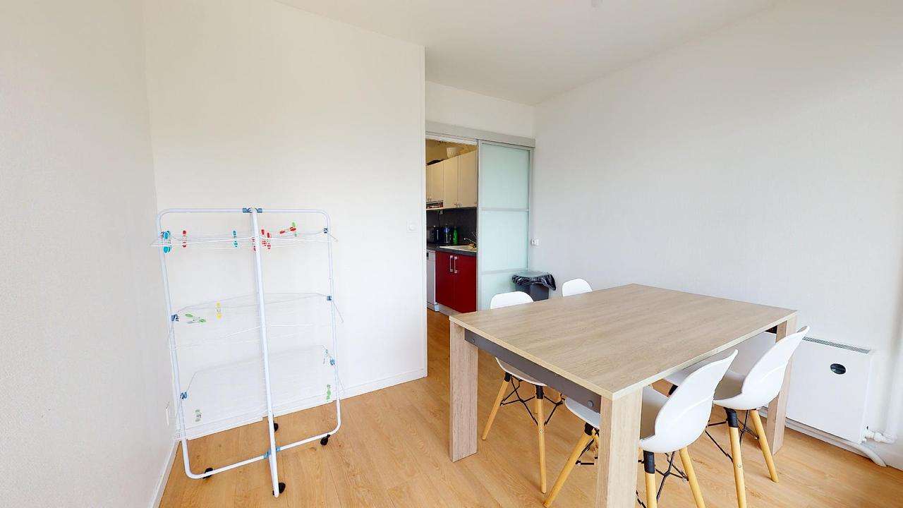 L'appartement dispose d'une pièce de vie équipée d'un canapé, d'une table basse et d'un meuble TV. Il possède également une cuisine séparée avec plaques de cuisson, réfrigérateur avec compartiment congélation, lave-vaisselle, four traditionnel, four à micro-ondes ainsi que de nombreux rangements. Attenante à cette cuisine, une salle à manger commune est également présente et est équipée d'une table à manger. Le logement dispose également d'un balcon attenant à la salle à manger.