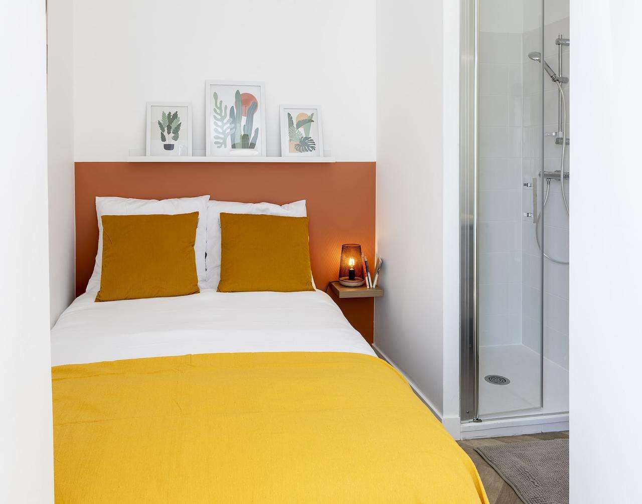 La chambre est louée avec un bureau, un lit double et une salle de bains privée.