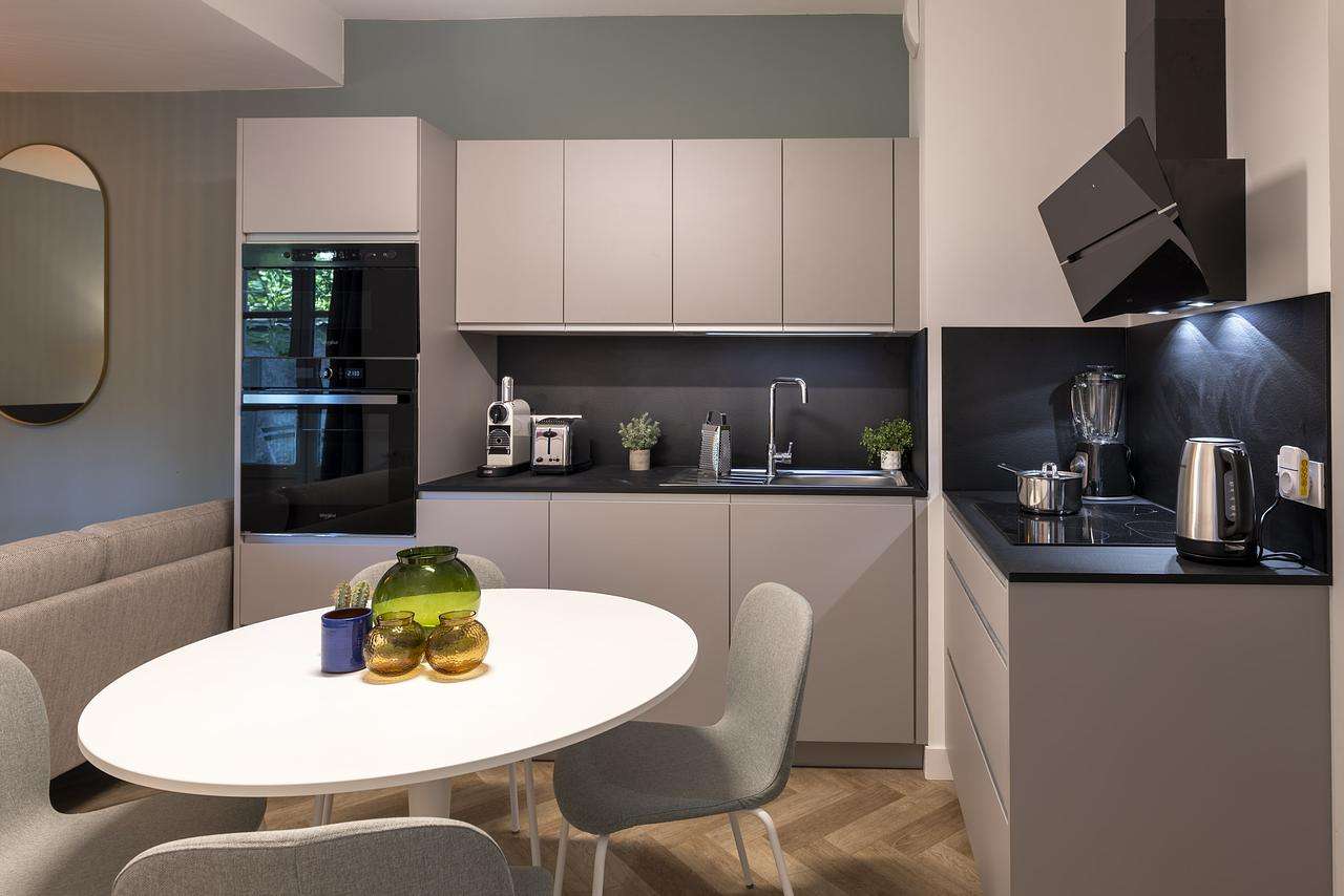 La cuisine est meublée d'un meuble de rangement. Elle comporte également un four, un lave-vaisselle, une machine à café, un micro-ondes et une plaque de cuisson.