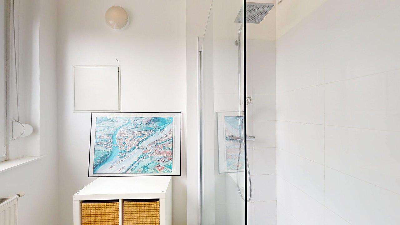 La salle d'eau possède une douche, un meuble vasque avec miroir ainsi qu'une machine à laver.