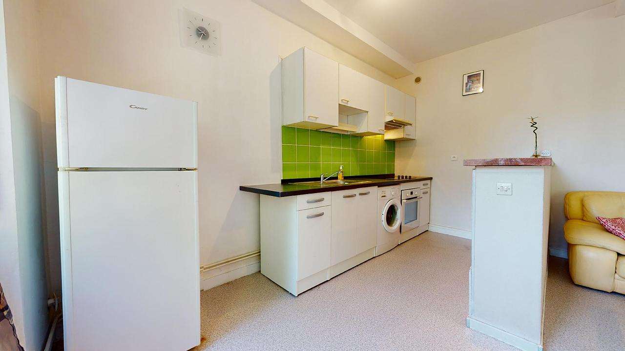 L'appartement est composé d'une chambre, d'une cuisine équipée d'un four, d'un meuble de rangement ainsi que d'une plaque de cuisson et d'une salle de bains avec baignoire.