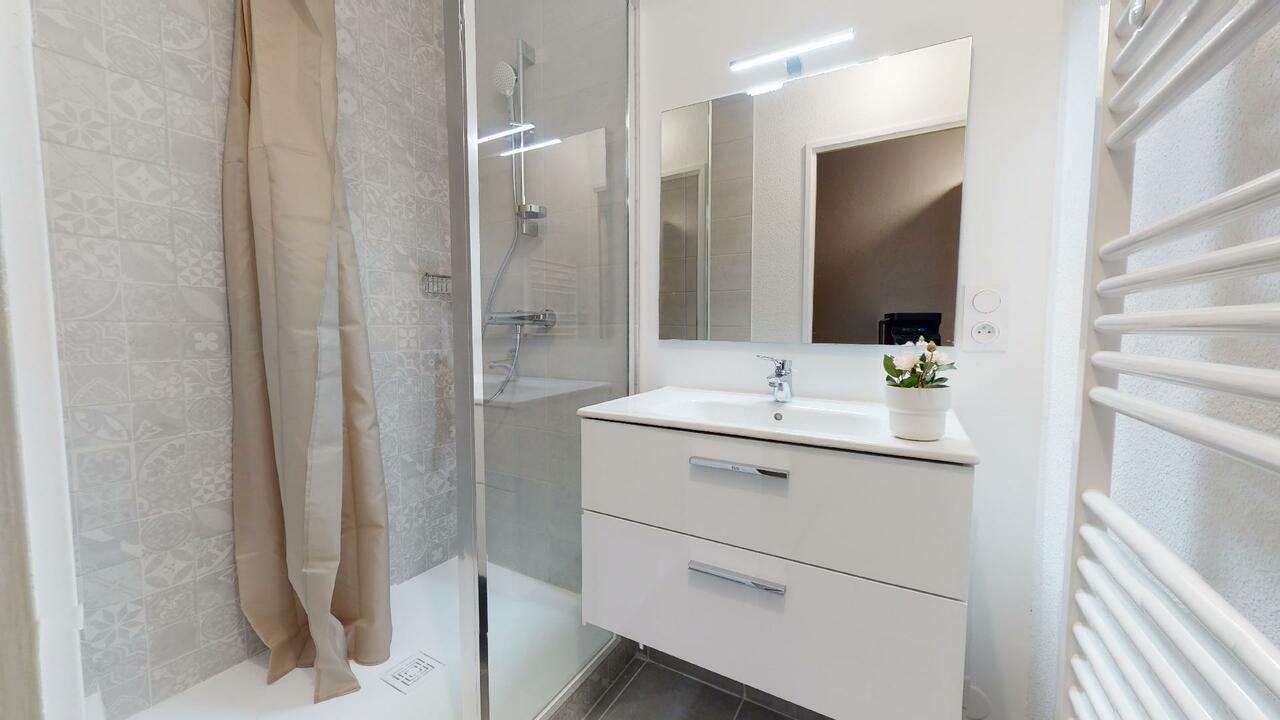 Deux salles de bains : une avec douche et meuble vasque / une avec grande douche, meuble vasque et machine à laver