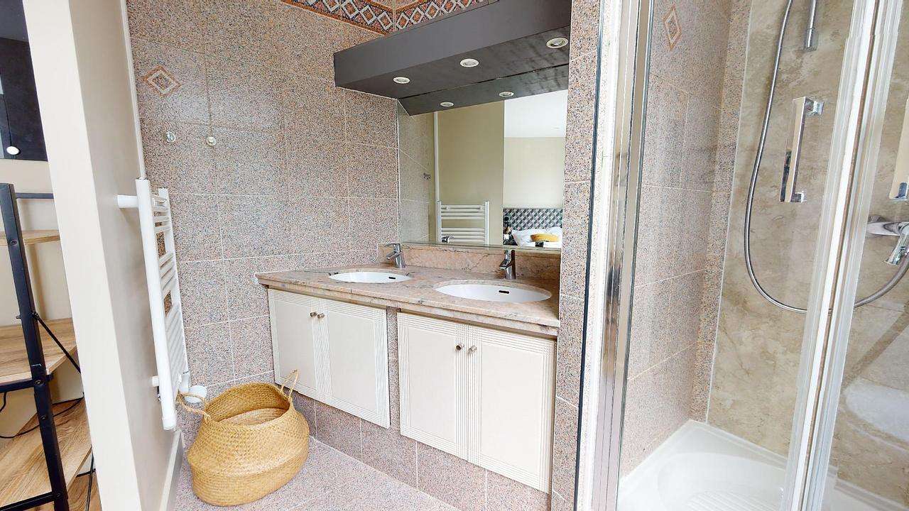 Cette chambre comporte une grande salle de bain avec douche, double vasques et WC.