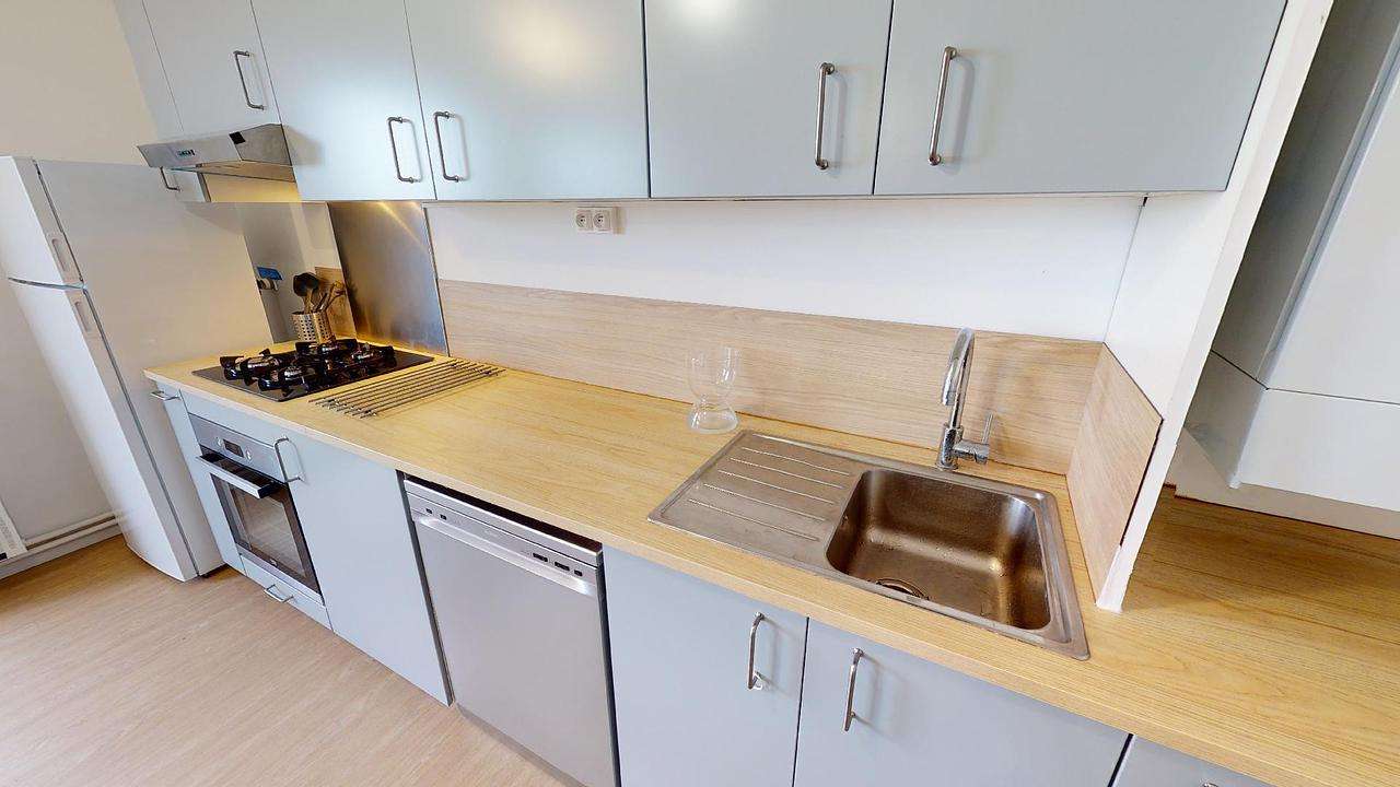 Une cuisine ouverte sur salon équipée avec lave-vaisselle, four, plaque de cuisson, hotte, micro-ondes, frigo ainsi que de nombreux rangements