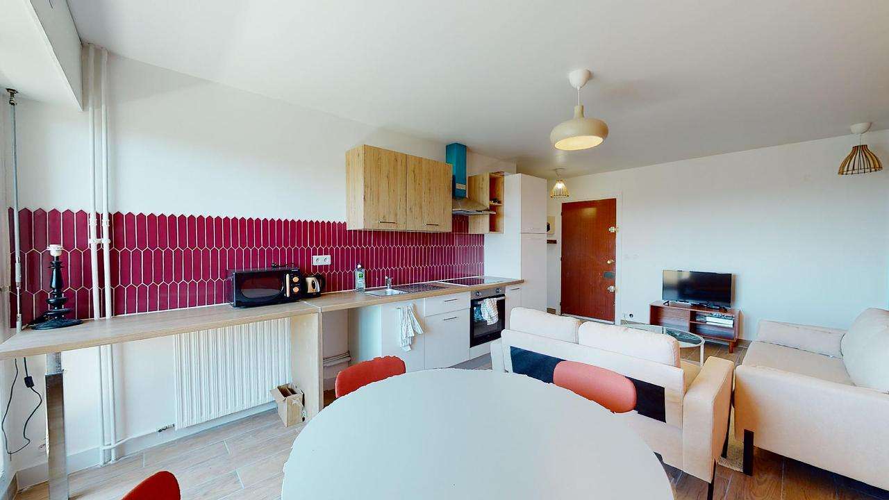 Dès l’entrée du logement, vous découvrirez une cuisine très bien équipée (Four, micro-ondes, plaques de cuisson, hotte, frigidaire) et qui s’ouvre sur un agréable salon et un balcon. Le salon se compose de deux canapés, d’une table basse, d’un tapis, d’un meuble TV et d’une TV. Une table ronde et ses cinq chaises viennent compléter cet espace.