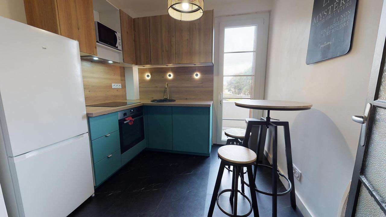 La cuisine quant à elle est séparée et entièrement équipée avec un four, un frigo, des plaques de cuisson, des rangements, une hotte, etc.