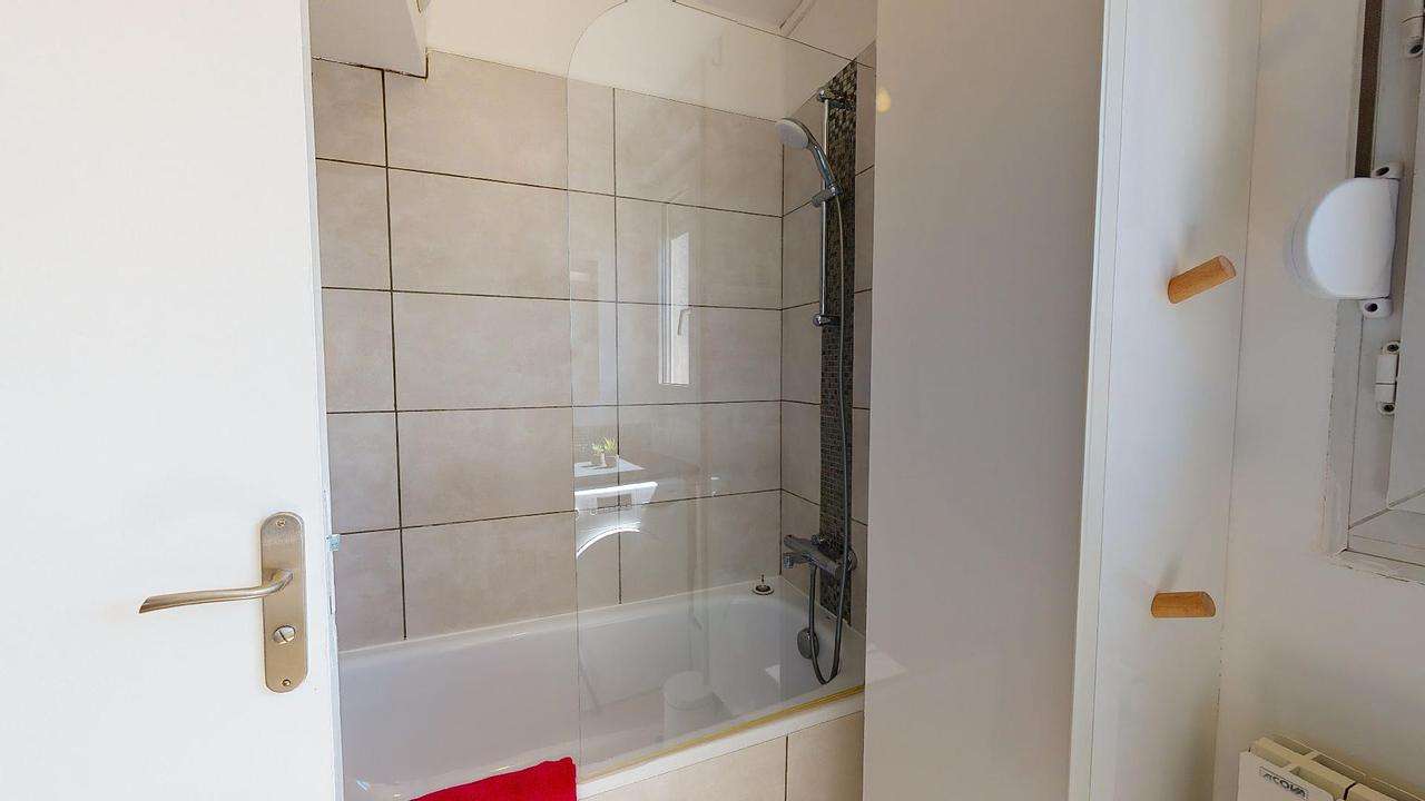 Une grande salle de bain avec douche, meuble vasque, machine à laver et sèche ligne ainsi que des WC séparés viennent compléter ce logement.