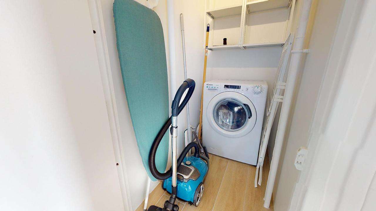 Enfin le logement dispose de deux salles de bain. La première dispose d’un meuble vasque, d’une douche et d’un porte serviette. La seconde est plus grande et dispose d’une machine à laver, d’une douche, d’un meuble vasque, d’un wc et d’un meuble étagère. À noter la présence d’une seconde machine à laver dans un petit espace buanderie. L’ensemble des parties communes sont à la disposition des colocataires, il convient de mettre en place une organisation qui sied à tous.