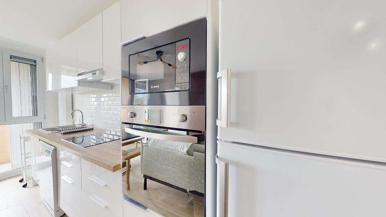 L’appartement à été entièrement rénové et agencé avec du mobilier de goût. Dès l’entrée, vous découvrirez un grand et lumineux espace de vie disposant d’une cuisine ouverte sur un salon. Vous trouverez dans ce salon, un grand canapé, deux fauteuils en velours, une table basse, un tapis et une grande TV murale. La cuisine est très jolie et équipée d’un four, d’un micro-onde, d’un lave-vaisselle, d’un frigidaire, de plusieurs plaques de cuisson électriques, ainsi que de plusieurs accessoires de cuisine (grille pain, bouilloire, machine à café, hotte etc).