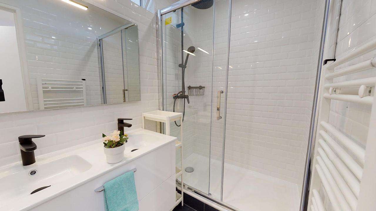 Deux salles de bain une avec grande douche et double vasques et une avec douche et meuble vasque ainsi que des WC séparés viennent compléter ce logement.