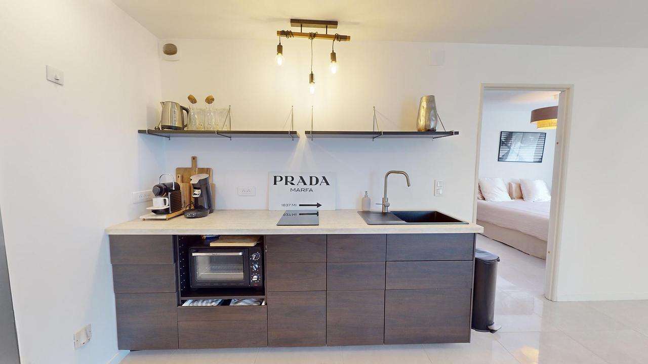 Profitez d'une cuisine ouverte sur le salon, équipée d'une table à manger avec quatre chaises élégantes. Cette cuisine moderne inclut un réfrigérateur, des plaques de cuisson, un micro-ondes et une machine à café. De nombreux rangements sont à votre disposition pour une organisation optimale.