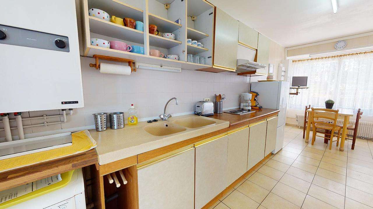 L'appartement se compose, au rez-de-chaussée, d’une très grande chambre de 21 m carré avec salle de bain privative, de la cuisine entièrement équipée avec un bel espace salon dans la véranda