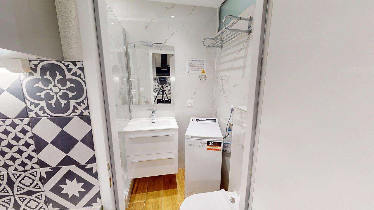La salle d’eau récemment rénovée comprend une douche moderne, un meuble vasque avec rangements, des WC et un lave-linge.