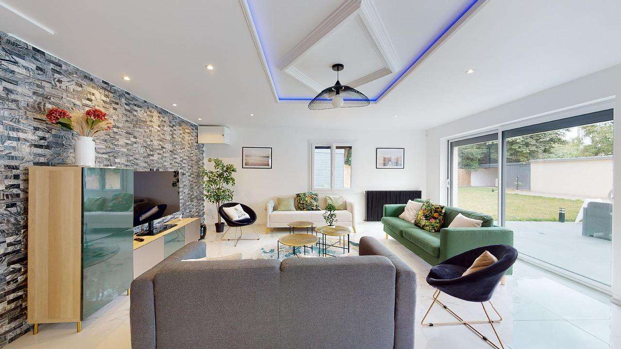 La pièce de vie dispose d’une cuisine entièrement intégrée et équipée (four, micro-ondes, frigidaires, tables à manger, plateau de travail, lave-vaisselle, etc.) et d’un lumineux salon agencé avec du mobilier de standing (Meuble TV, TV, canapés, ensemble de tables basse, fauteuils, etc). Ces espaces s’ouvrent sur une belle terrasse, son salon d’été et le jardin. Enfin, les salles d’eau du logement sont communes et disposent toutes d’un meuble vasque et d’une douche.