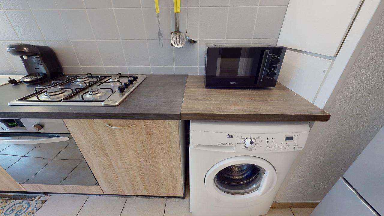 La cuisine est bien équipée, munie de son four, d’un micro-ondes, de plaques de cuisson, d’un grand frigidaire, d’un lave-vaisselle, d'un lave-linge, ainsi que de nombreux rangements. Le salon dispose d’une grande et belle table à manger accompagné de quatre chaises, d’un grand canapé, d’un meuble TV, d’un TV, et d’une table basse.