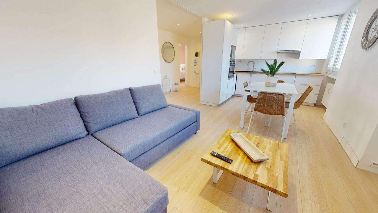 Cette colocation comporte un salon à la décoration moderne aménagé avec un canapé, une table basse, une TV, une table à manger, et une cuisine.